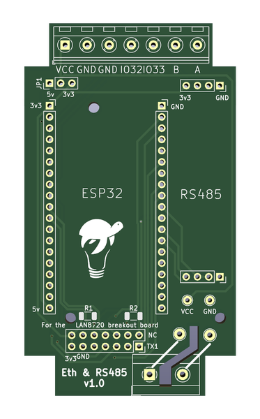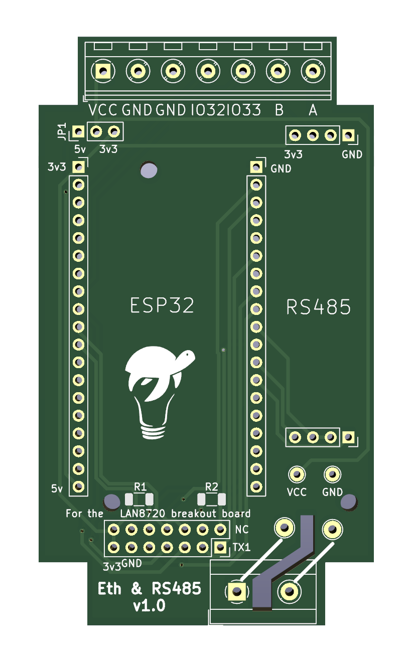 The PCB came out pretty enough, I added connections for the screw terminals to have the needed signals accessible from the outside, all professional and such! I even went so far as to add a jumper to select if we are supplying 5v or 3.3v to the ESP32, as the RS485 transceiver will be supplied with 3.3v, and this may come from the ESP's LDO if we are feeding 5v in, or directly for the external 3.3v line, if that's what we have.