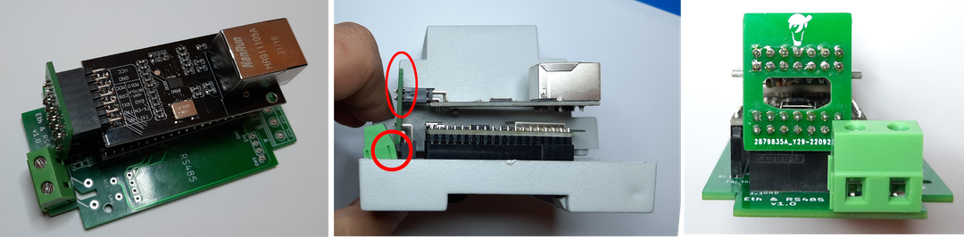 The riser card suffered a few changes too, by connecting it on the opposite side of the main PCB connector, so closer to the ESP32 and away from the offending case wall, along with a much larger hole and, to allow the same relative position of the LAN card on top of the ESP32, the use of the hybrid connection mentioned before, with the connector soldered on the back, i.e. the opposite side from where the LAN card gets connected to.