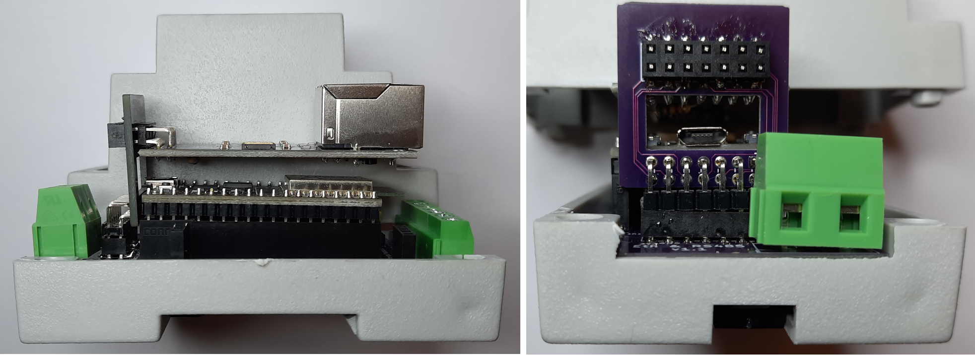 The right image shows a less important but still quite annoying issue, as I had left a hole on the riser PCB to allow connecting the ESP32 through USB do power, program and debug with the LAN board attached and not only the hole is too small for any micro USB cable I own, it is also, and this is subtle I know, not ideally located.