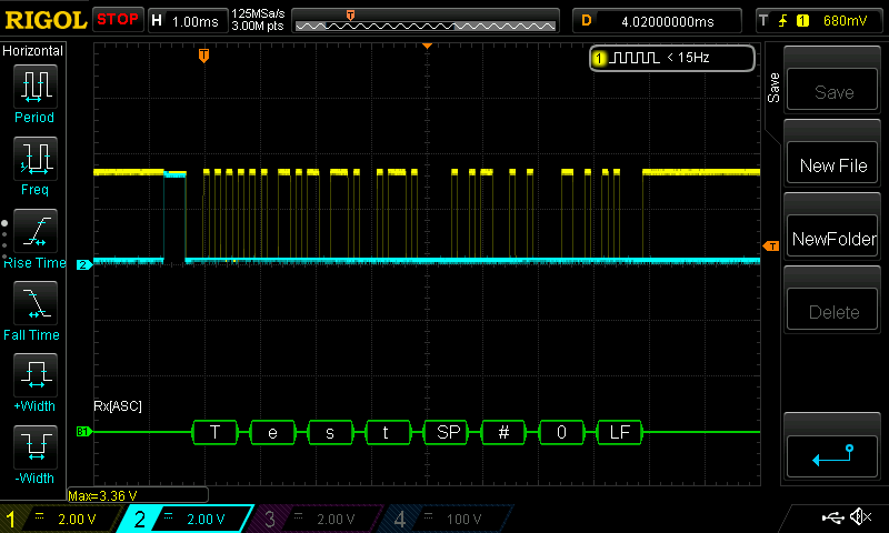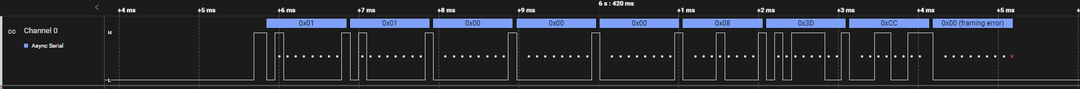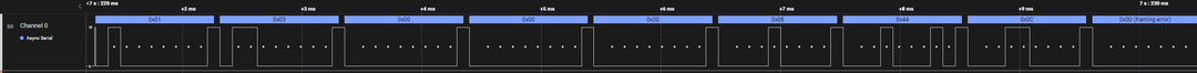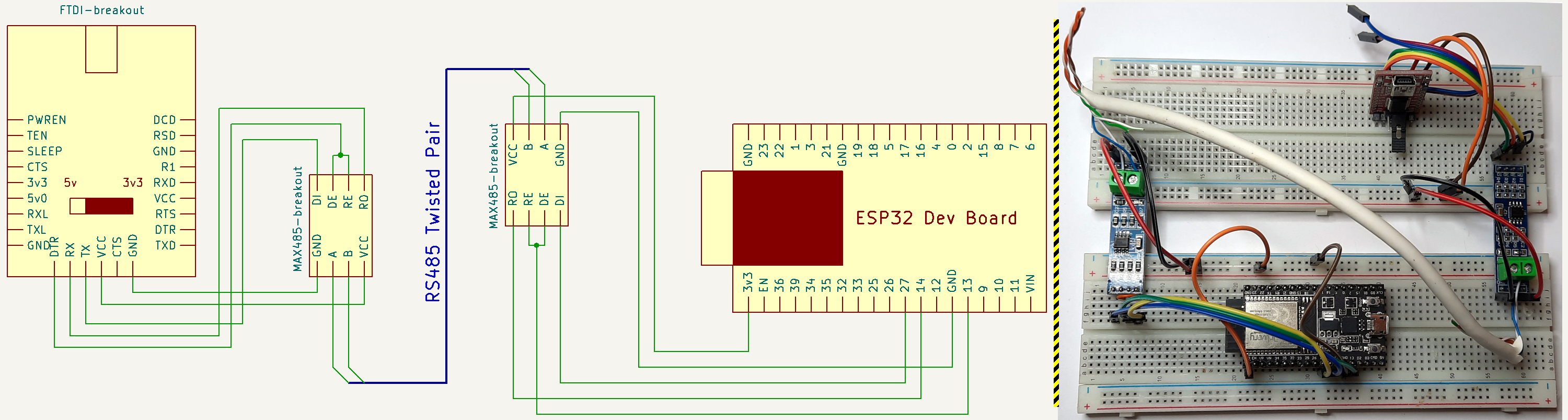 You may have noticed the mp_checkFrame monkey patched function. This is the product of a weird behavior from the RS485 transceiver attached to the USB serial adapter. When I drive the nRE/DE line low, i.e. when the transceiver is in RX mode, the RO line gets driven low too, which I believe is against the RS232 standard, ultimately resulting in a fake trailing zero that should not be read as it does not have the stop bit, but that my serial adapter happily accepts. The transceiver attached to the ESP32 does not behave like this, and I did try switching them around to no avail. I guess, and this is really just a guess, that when in RX mode the RO pin is left floating until data is received, at which point it begins being driven correctly, and the fact I'm abusing the Data Terminal Ready pin on the USB converter is pulling down the line (as DTR being false is the state used to indicate TX).
