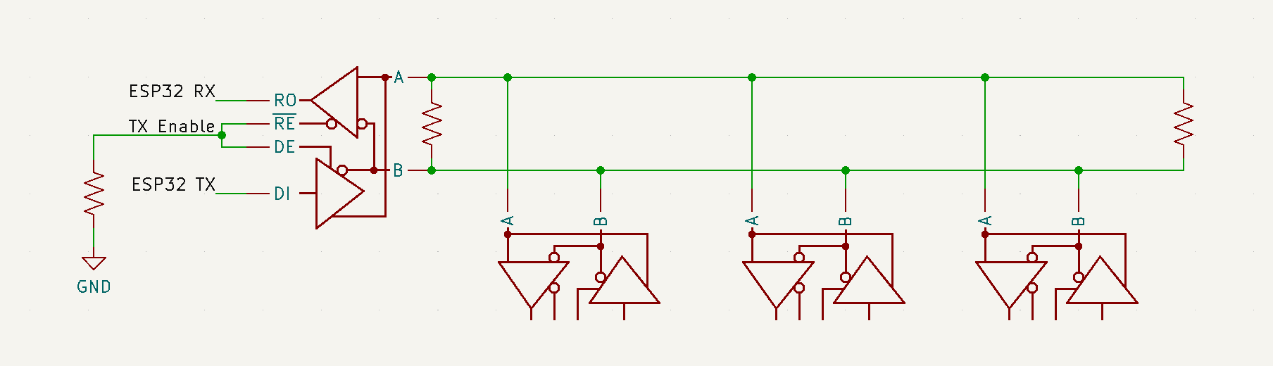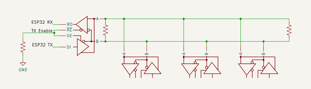 The RS485 part is simple, but it does have a pitfall with my particular transceiver, not sure if others have a smarter way of handling this... You see, RS485 is half duplex, so each side needs to drive the transmission part of the transceiver only when transmitting, which in this case is achieved through the nRE and DE inputs which, being inverted between each other, so RE is active low and DE is active high, we can drive both through the same output pin on the microcontroller. This output should kept low most of the time, for receive enable active, and be driven high for the duration of the transmits.