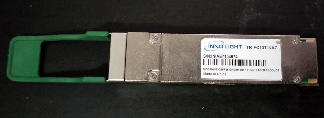 Anyway, long story short(ish), I grabbed a handful of Innolight branded transceivers for about €11 a pop shipped, a few 20m single mode fibre patch cables, duplex LC/LC of course, and crossed my fingers these would all work well together. I'm skipping a lot of information here, such as the fact that to work over a single pair of fibres at this speed there's a specific modulation, and I have no idea if these will require attenuators or not, they don't state a range but CWDM4 (that's the modulation) is supposed to be rated for "up to 2km over duplex single mode fibre". I'm sure it'll be fine...