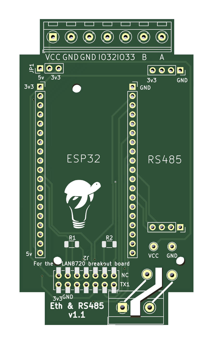 The PCB came out pretty enough, I added connections for the screw terminals to have the needed signals accessible from the outside, all professional and such! I even went so far as to add a jumper to select if we are supplying 5v or 3.3v to the ESP32, as the RS485 transceiver will be supplied with 3.3v, and this may come from the ESP's LDO if we are feeding 5v in, or directly for the external 3.3v line, if that's what we have.